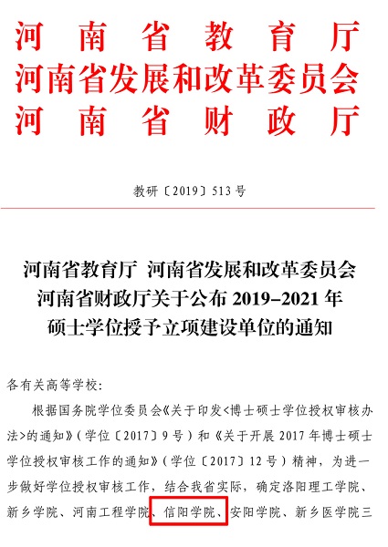 日前,从河南省教育厅、河南省发展和改革委员会、河南省财政厅下发的《关于公布2019-2021年硕士学位授予立项建设单位的通知》(教研〔2019〕513 号)中获悉,信阳学院与7所兄弟高校一起,获批为硕士学位授予立项建设单位,赢得了一个新的极为重要的建设与发展平台,取得了人才培养和事业发展的新突破。