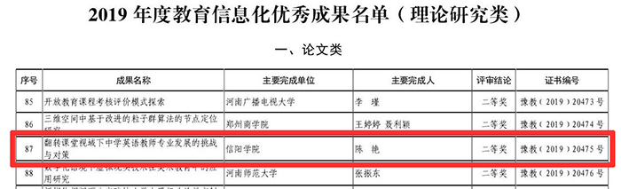 其中,我校外国语学院教师陈艳申报的《翻转课堂视域下中学英语教师专业发展的挑战与政策》项目荣获教育信息化理论研究类成果二等奖;文学院教师王松申报的《网络语言分析在语言学概论教学中的应用》、理工学院教师王倩倩申报的《大学生创新性化学实验的教学改革探讨》、土木工程学院教师付善春申报的《基于结构设计竞赛的应用型人才创新实践能力培养研究-以M学院为例》等3篇论文荣获教育信息技术应用优秀成果三等奖。