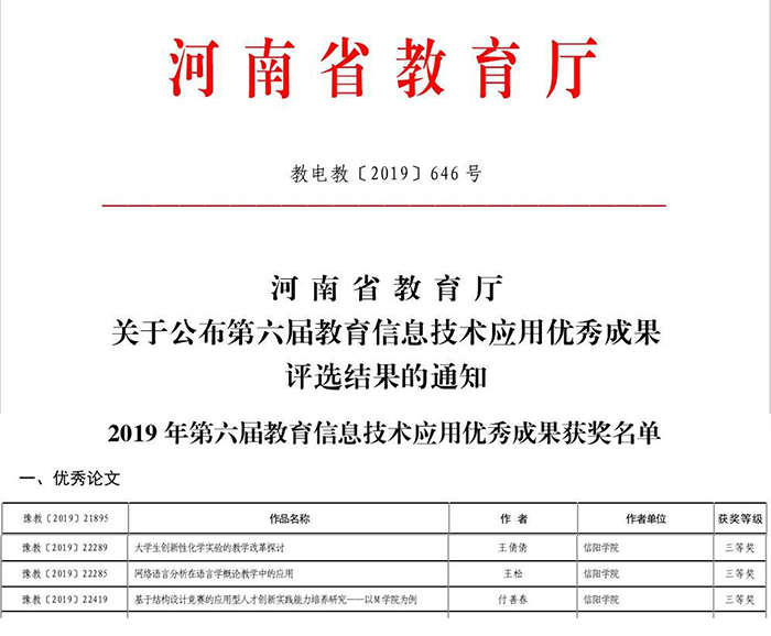 近日,从河南省教育厅发布的《关于公布2019年度河南省教育信息化优秀成果获奖名单的通知》(教科技〔2019〕650号)《关于公布第六届教育信息技术应用优秀成果评选结果的通知》(教电教〔2019〕646号)文件中获悉,我校荣获1项河南省教育信息化优秀成果奖、3项教育信息技术应用优秀成果奖。