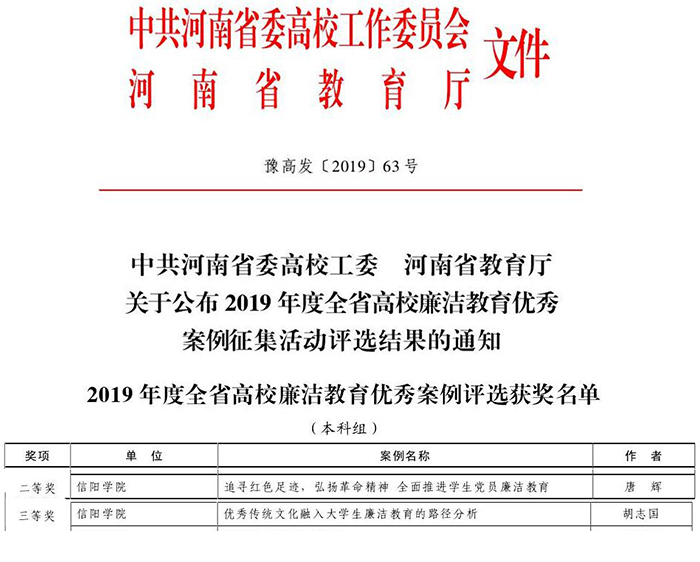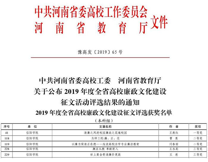 根据中共河南省委高校工委、河南省教育厅日前印发的《关于公布2019年度全省高校廉政文化建设征文活动评选结果的通知》([2019]65号)和《关于公布2019年度全省高校廉洁教育优秀案例征集评选结果的通知》([2019]63号),我校在廉政文化建设征文中取得了一等奖1项、二等奖2项、三等奖2项的佳绩;在本次廉洁教育优秀案例征集活动中取得了二等奖1项、三等奖1项的好成绩。
