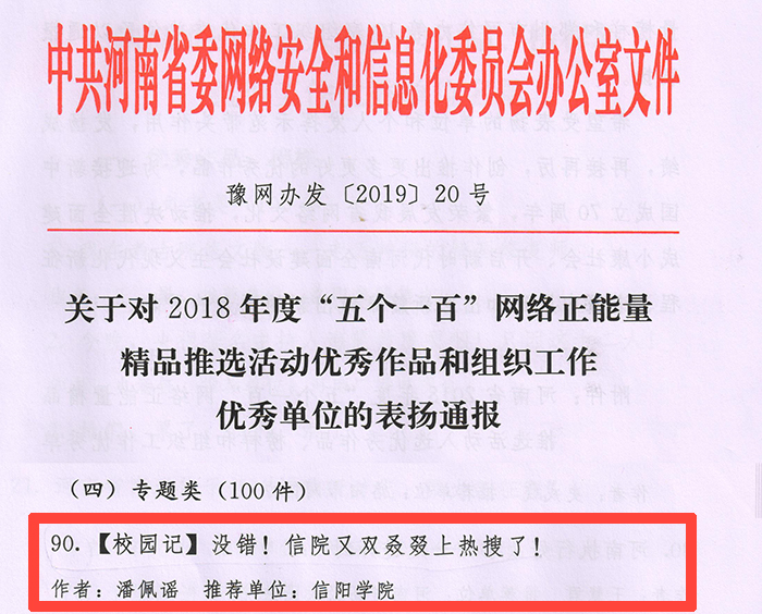 日前,省委网信办发布了《关于对2018年度“五个一百”网络正能量精品推选活动优秀作品和组织工作优秀单位的表扬通报》([2019]20号文件),我校党委宣传部选送的微信作品《【校园记】没错!信院又双叒叕上热搜了!》成功入选百件专题类优秀作品。