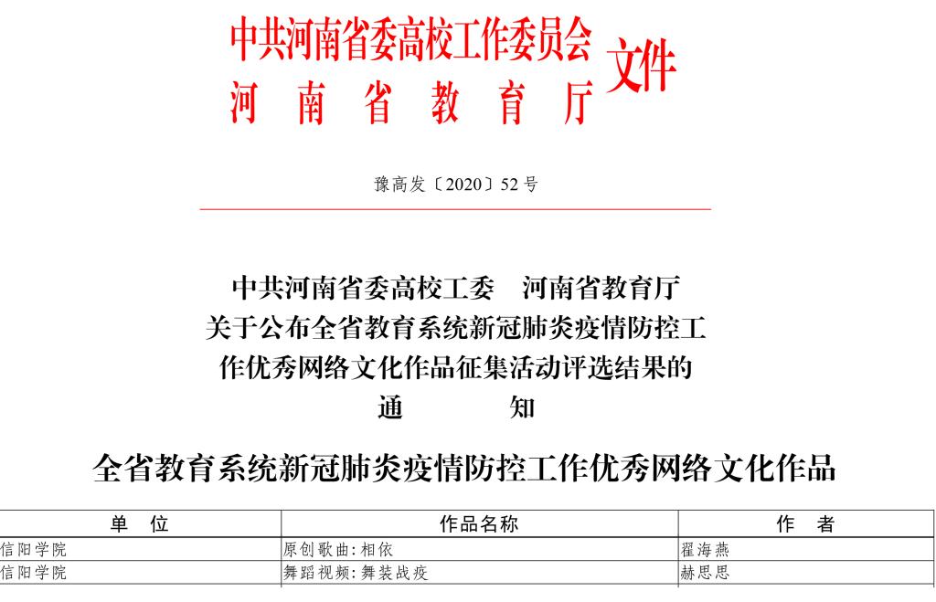 近日,河南省教育厅下发《关于公布全省教育系统新冠肺炎疫情防控工作优秀网络文化作品征集活动评选结果的通知》(豫高发〔2020〕52号),我校教育学院教师翟海燕的原创歌曲《相依》、音乐学院教师赫思思的舞蹈视频《舞装战疫》被评为战“疫”优秀网络文化作品。