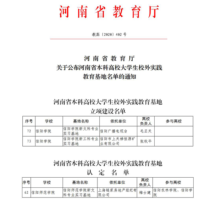 其中,我校申报的“信阳学院新文科专业实习基地—信阳广播电视台”“信阳学院新工科专业实习基地—信阳市上天梯恒源矿业有限公司”获批河南省大学生校外实践教育基地立项建设;与信阳师范学院联合申报的“新文科专业实习基地—上海链家房地产经纪有限公司”被认定为河南省大学生校外实践教育基地。