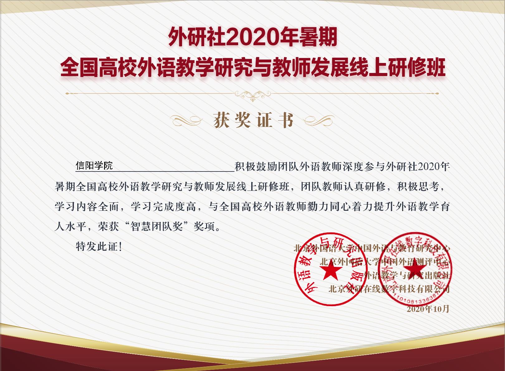 近日,外研社对参与2020年暑期研修班的广大教师和积极组织开展研修、交流的各地院校进行表彰,我校喜获2020年外研社暑期线上研修班 “智慧团队奖”。