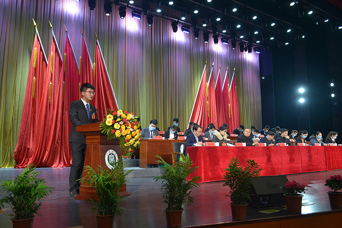 校团委书记郑山峰为大会致辞。第一届学生委员会执行主席杜萌蕾作了题为“聚力新阶段 奋斗新征程——团结带领全校同学为打赢打好迎评促建攻坚战贡献力量”的工作报告。