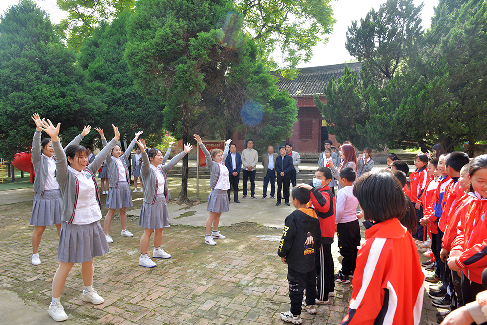 参观之后,学校和学院领导慰问了尖山小学师生。2019级学前教育本科1班的学生代表为尖山小学的小朋友们展示了优美的舞蹈,并带领小朋友们一起玩游戏,拉近了与小朋友们的距离。