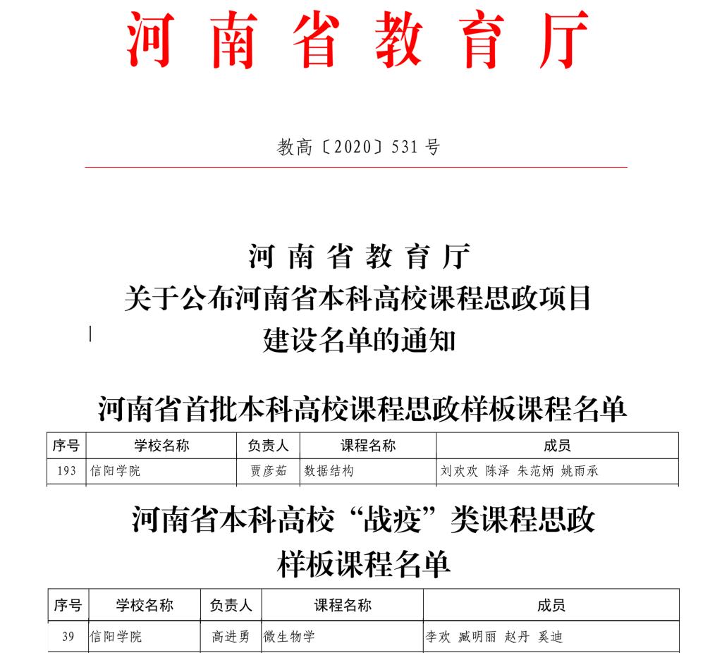 近日,河南省教育厅下发《关于公布河南省本科高校课程思政项目建设名单的通知》(教高〔2020〕531号),我校申报的《数据结构》课程被认定为河南省首批课程思政样板课程,《微生物学》课程被认定为“战疫”专题课程思政样板课程。