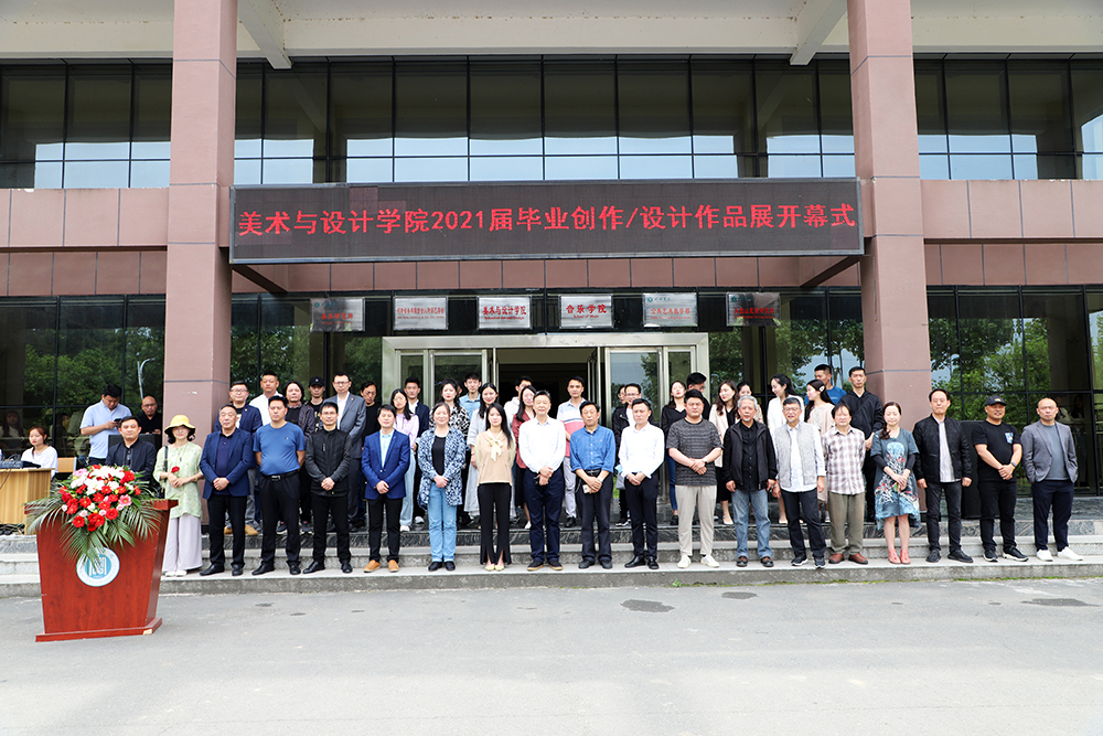 5月20日,“多元·融合”美术与设计学院2021届毕业创作/设计作品展开幕式在艺术楼前广场举行。信阳市文化广电和旅游局非遗科科长王清丰,我校副校长王志华、校长助理高雅,教务处处长陈文涛、评建办常务副主任张富庄,美术与设计学院院长张瑞瑞、党总支书记袁军,以及来自信阳市设计行业的20余名企业代表,美术与设计学院专家教授、指导教师和毕业生参加了开幕式。