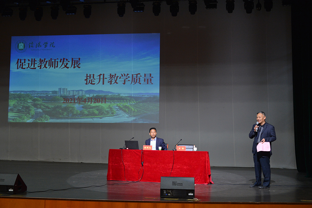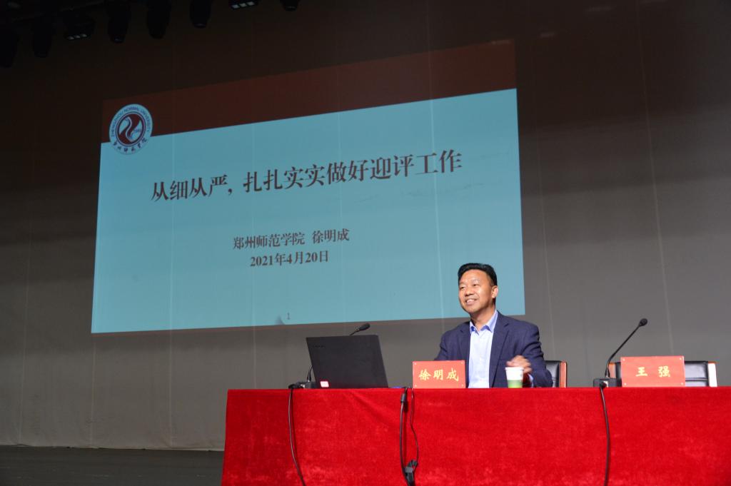 4月20日,应我校邀请,郑州师范学院教务处处长徐明成教授在我校音乐厅作了题为《从细从严,扎扎实实做好迎评工作》的报告。副校长王强出席并主持报告会。各学院院长、教学管理人员及青年骨干教师,教务处、教师发展中心、教学质量监控中心及评建办干部职工等500余人聆听了报告。