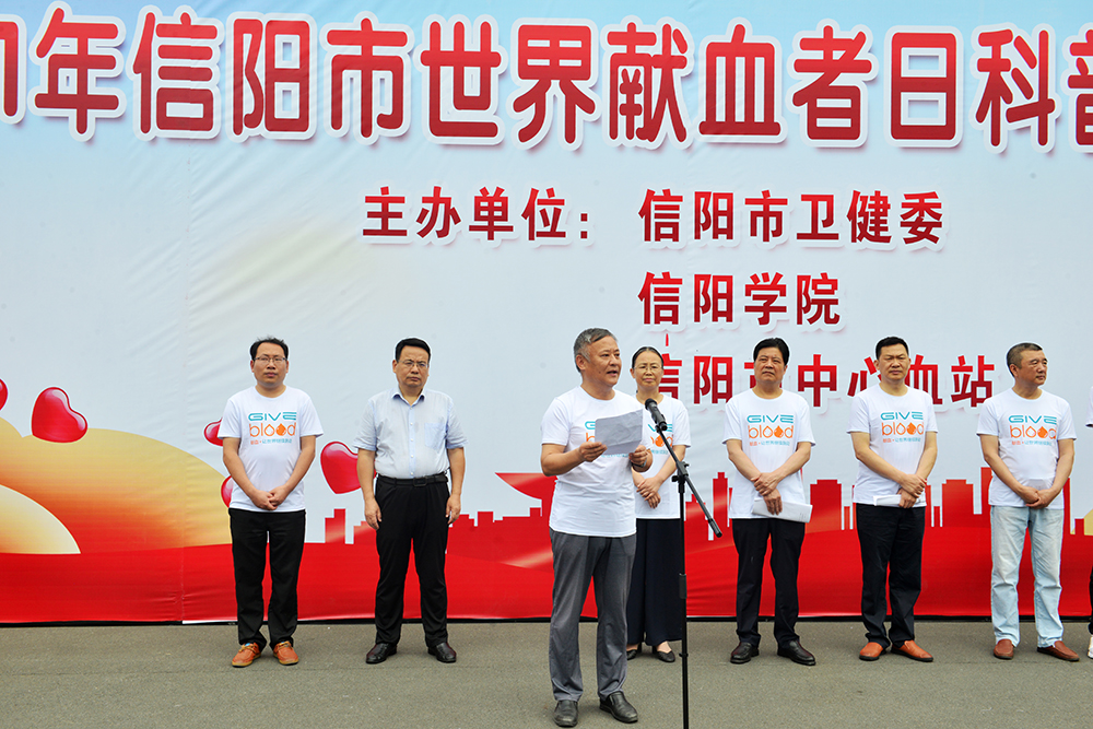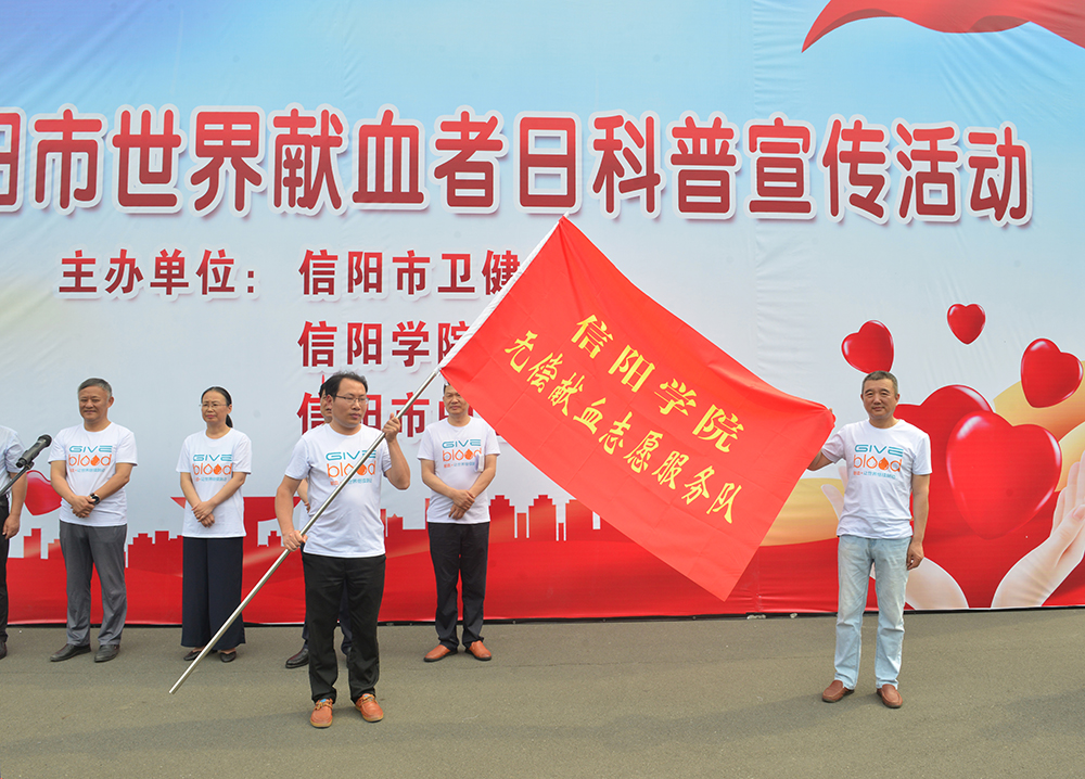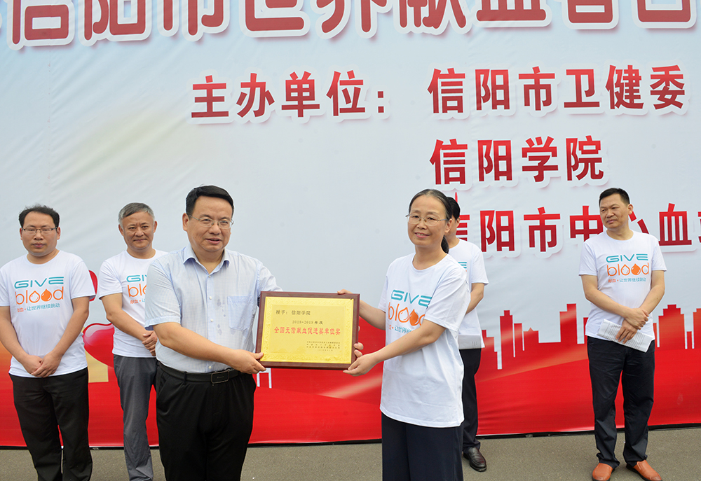 6月10日上午,学校举行“全国无偿献血促进奖”授牌仪式。信阳市红十字会常务副会长李俊杰,市卫健委副主任宋建荣,市中心血站站长曾宪国、副站长李汉中,我校副校长王强,有关单位负责人万建章、郑山峰、夏晓勤,学校献血志愿者代表及相关新闻媒体单位出席了授牌仪式。