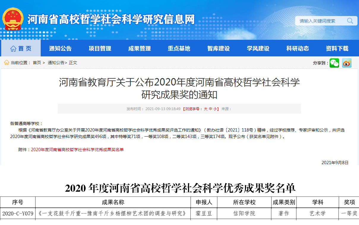 河南省高校哲学社会科学优秀成果奖是河南省哲学社会科学领域公信力高、影响力强的评选活动。坚持质量第一的导向,按照政治标准与学术标准相统一的原则,着力提升河南省高校社科研究原创能力,加快推进具有中原特色的哲学社会科学学科体系、学术体系、话语体系建设。据悉,本次经过学校推荐、专家评审和公示,共评选2020年度河南省高校哲学社会科学研究成果奖496项,其中特等奖71项,一等奖108项,二等奖143项,三等奖174项。