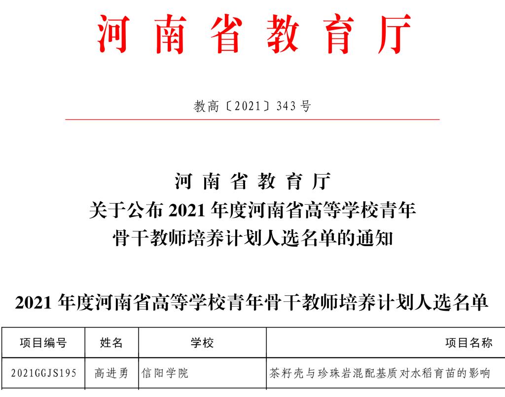 日前,河南省教育厅下发《关于公布2021年度河南省高等学校青年骨干教师培养计划人选名单的通知》(教高〔2021〕343号),经个人申报、学校遴选推荐、专家评审、结果公示,我校理工学院教师高进勇成功入选。截至目前,我校已有8名教师入选河南省高校青年骨干教师资助计划资助对象。