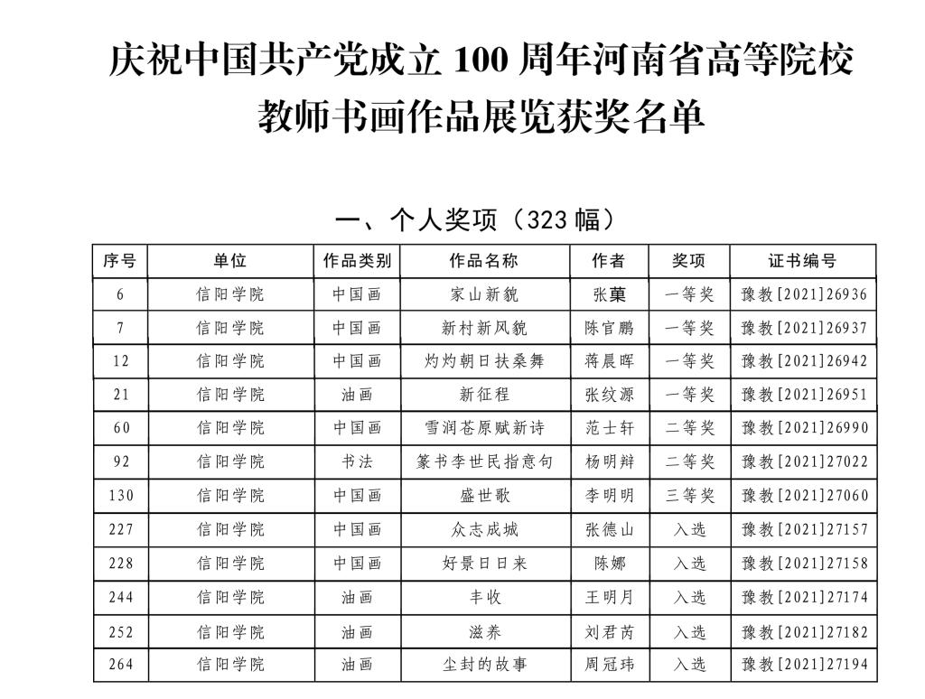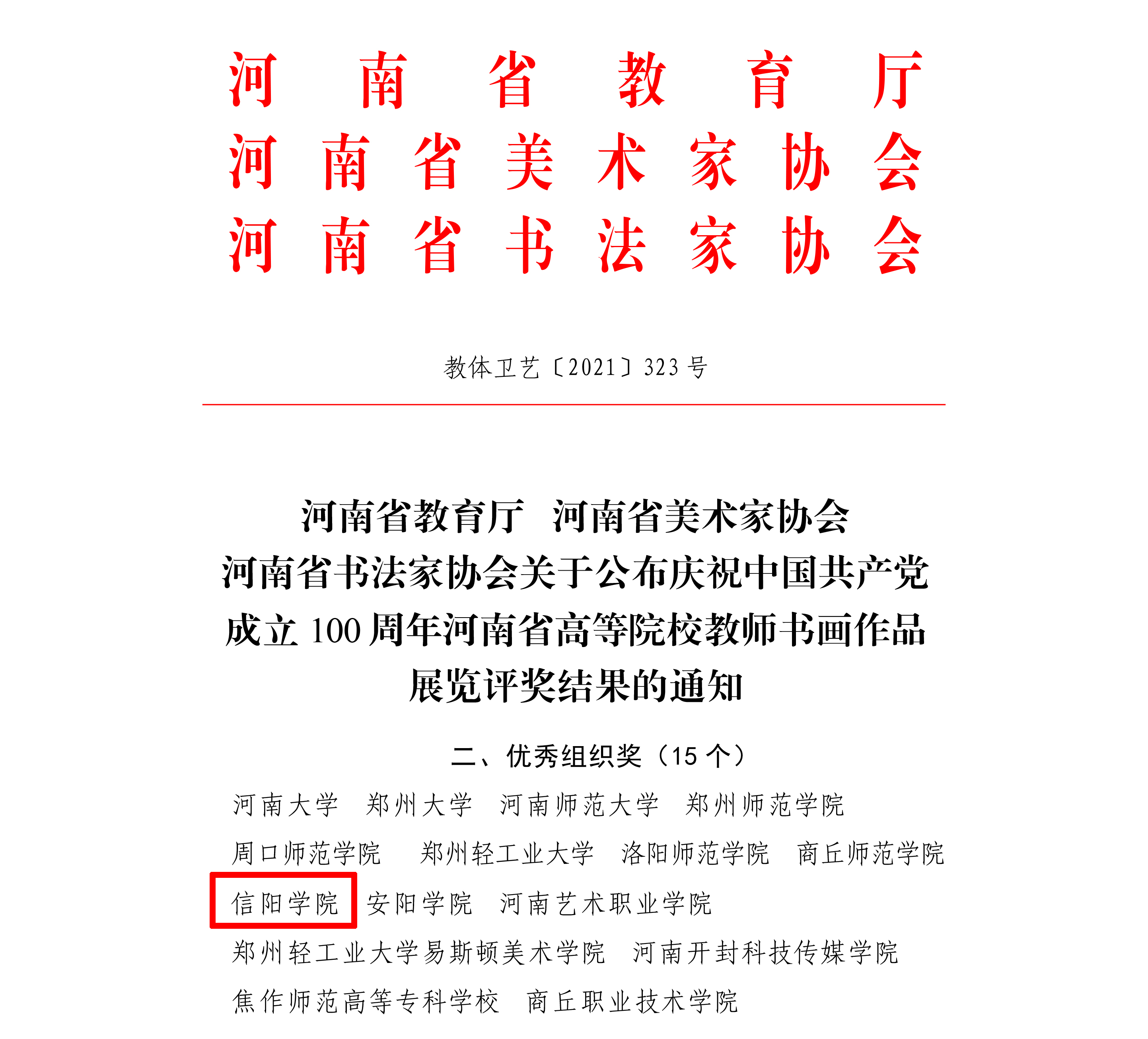 近日,由河南省教育厅、河南省美术家协会、河南省书法家协会联合举办的庆祝中国共产党成立100周年河南省高等院校教师书画作品展览的评奖结果公布。我校共有12件作品获奖,一等奖4项,二等奖2项,三等奖1项,入选奖5项。同时,学校荣获“优秀组织奖”。
