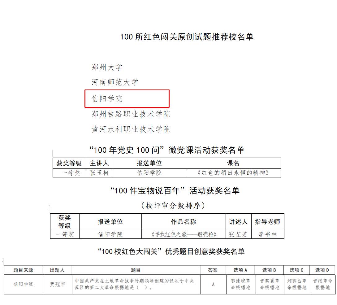 近日,中共河南省委高校工委、河南省教育厅、河南广播电视台公布庆祝建党100周年“100年党史100问”“100件宝物说百年”“100校红色大闯关”获奖名单,我校荣获一等奖2项,创意奖1项;入选“100所红色闯关原创试题推荐校”。
