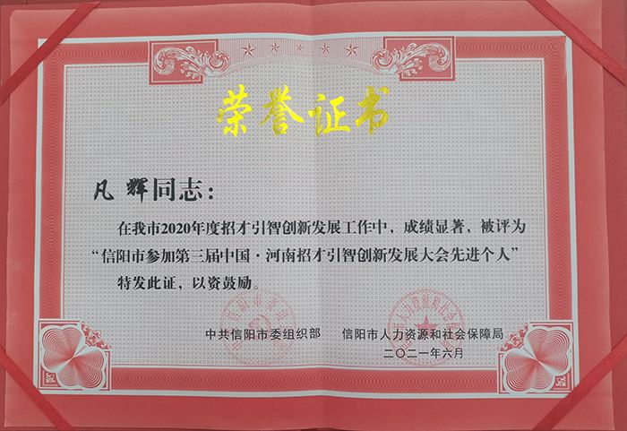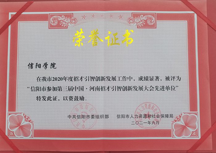 近日,中共信阳市委组织部与信阳市人力资源和社会保障局联合下发了《关于表彰我市参加第三届中国·河南招才引智创新发展大会“2020招才引智专项行动”先进单位和先进个人的通报》(信人社函[2021]25号),对39个先进单位和91名先进个人予以表彰。我校被评为信阳市参加第三届中国·河南招才引智创新发展大会“先进单位”;凡辉同志被评为“先进个人”。