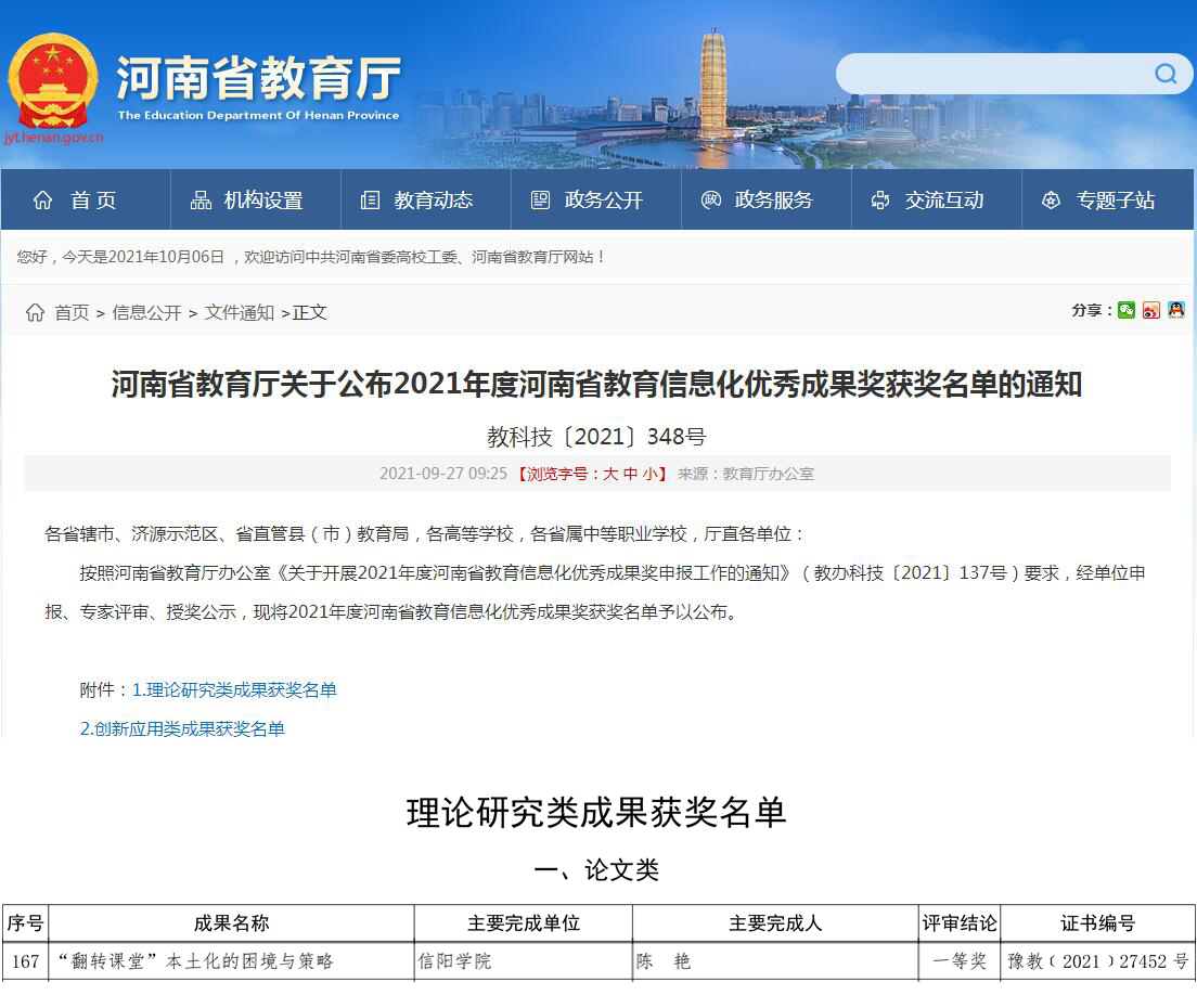 近日,2021年度河南省教育信息化优秀成果奖获奖名单公布,我校外国语学院教师陈艳的学术论文《“翻转课堂”本土化的困境与策略》荣获理论研究类成果一等奖。