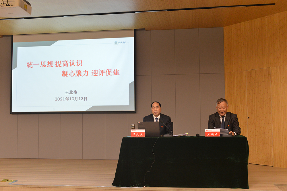 王北生以《统一思想 提高认识 凝心聚力 迎评促建》为题,从“学校的历史沿革及更名以来取得的重大成绩”“办学思路与定位”“顶层设计”“当前评估政策形势与下一时期的重点工作”“凝心聚力,共筑‘以校为家、爱校爱家’的精神家园”等方面,系统梳理了学校的历史进程和转设以来取得的重大发展成就,深刻解读了学校的办学定位、校训及“三风”、学校精神、办学信念等,客观分析了迎评工作所面临的严峻形势,进一步明确了学校今后一段时间的工作重点,并就“以校为家,爱校如家”话题与大家展开了深入探讨。