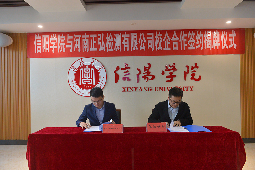 在热烈的气氛下,杨高伟和殷昊共同签订了信阳学院与河南正弘检测有限公司产学研合作协议书。