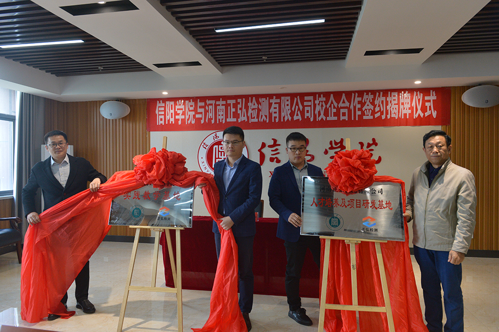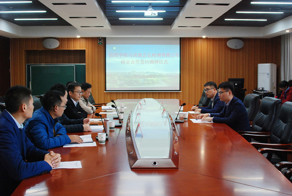 10月18日,信阳学院与河南正弘检测有限公司校企合作签约揭牌仪式在综合楼1410会议室举行。河南正弘检测有限公司副总殷昊、技术负责人梁少珂,我校校长助理杨高伟出席仪式。教务处和土木工程学院负责人及部分师生代表参加了仪式。土木工程学院副院长杨子泉主持了仪式。