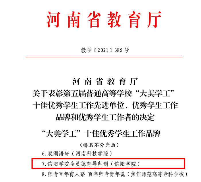 日前,河南省教育厅下发《关于表彰第五届普通高等学校“大美学工”十佳优秀学生工作先进单位、优秀学生工作品牌和优秀学生工作者的决定》(教学〔2021〕385号),信阳学院全员德育导师制荣获2021年河南省“大美学工”十佳优秀学生工作品牌称号。这是我校继2018年余婷婷获得第二届河南省“大美学工”十佳优秀学生工作者、2020年学校获得河南省“大美学工”十佳优秀学生工作先进单位之后收获的又一重要荣誉。