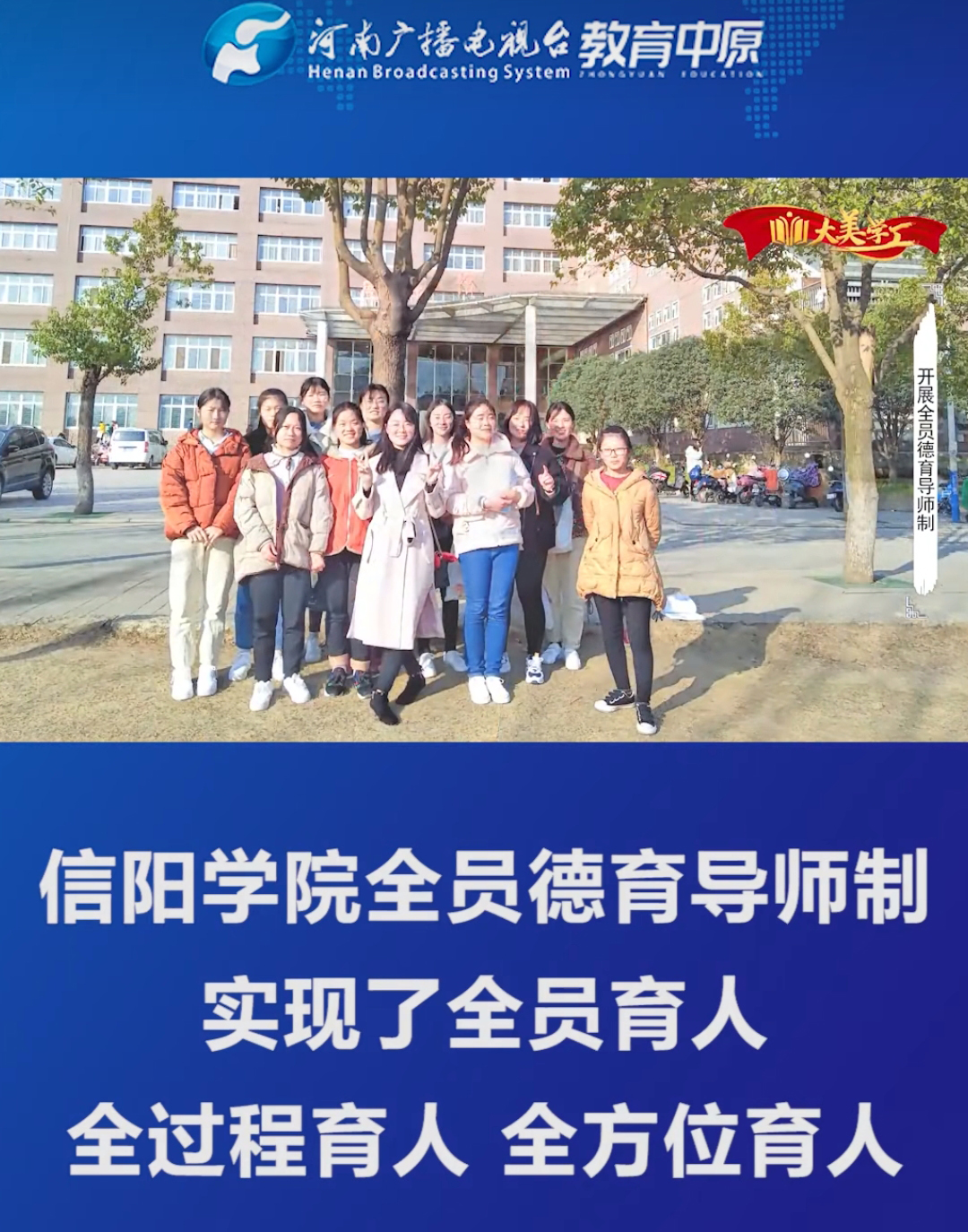 近日,河南广播电视台教育中原视频号以“信阳学院全员德育导师制实现了全员育人、全过程育人、全方位育人”为题,对我校“全员德育导师制”进行了全面报道。