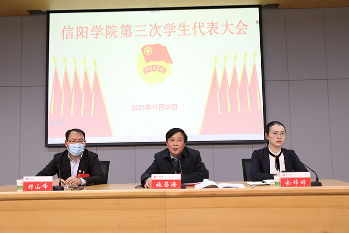 乘借学习贯彻党的十九届六中全会精神东风,在学校理事会和党委、行政热情关心、支持和全校师生密切关注下,11月30日,信阳学院第三次学生代表大会在图书馆报告厅隆重召开。大会采取线上线下相结合的方式进行。校党委专职副书记施昌海出席开幕式。党办、宣传部、学工部、招就处、校团委等部门负责人,各学院党总支书记、学工秘书、团总支书记和全体代表共同参加了开幕式。学工部长余婷婷主持了开幕式。