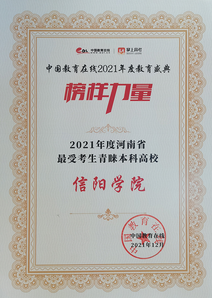 近日,中国教育在线“榜样力量·2021年度教育盛典”评选获奖名单揭晓,信阳学院荣获“2021年度河南省最受考生青睐本科高校”荣誉称号,在河南省文科500分数段用户模拟填报院校排名中位列第五。这份殊荣充分体现了学校办学成果得到了社会的广泛认可和高度赞扬,学校招生工作得到了考生和家长的充分肯定和普遍好评。