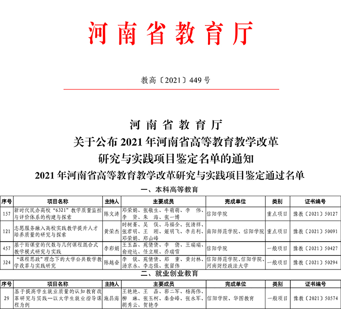 近日,河南省教育厅下发了《关于公布2021 年河南省高等教育教学改革研究与实践项目鉴定名单的通知》(教高〔2021〕449号),我校五项省级高等教育教学改革研究与实践项目通过鉴定。