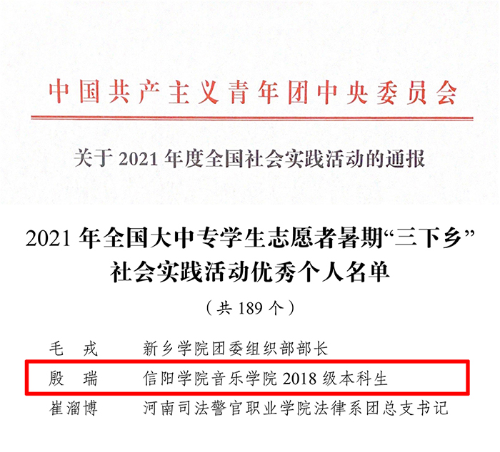 近日,团中央印发了《关于2021年度全国社会实践活动的通报》,从全国大中专学校评选出全国“三下乡”社会实践活动“先进个人”共189名。我校音乐学院2018级学生殷瑞在全国数以千万计的优秀学生中脱颖而出,荣获全国“三下乡”社会实践活动“先进个人”荣誉称号,为学校赢得了重大荣誉。