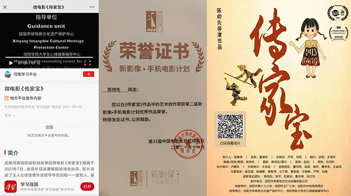 12月30日,第34届中国金鸡百花电影节在厦门落下帷幕,金鸡手机电影计划获奖作品出炉。我校优秀校友陈帅先执导的信阳儿童民俗短片《传家宝》荣获该比赛优秀作品荣誉,并获学习强国平台推介。
