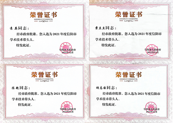 近日,信阳市人民政府办公室发布《关于公布第二批享受信阳市政府特殊津贴人员及2021年市学术技术带头人名单的通知》(信政办[2021]43号)。我校理工学院鲁辉教授荣获第二批享受信阳市政府特殊津贴专家,外国语学院陈艳副教授、文学院袁英副教授、社会科学学院胡志国副教授、音乐学院霍豆豆副教授等4名教师获得“2021年信阳市学术技术带头人”称号。