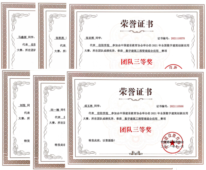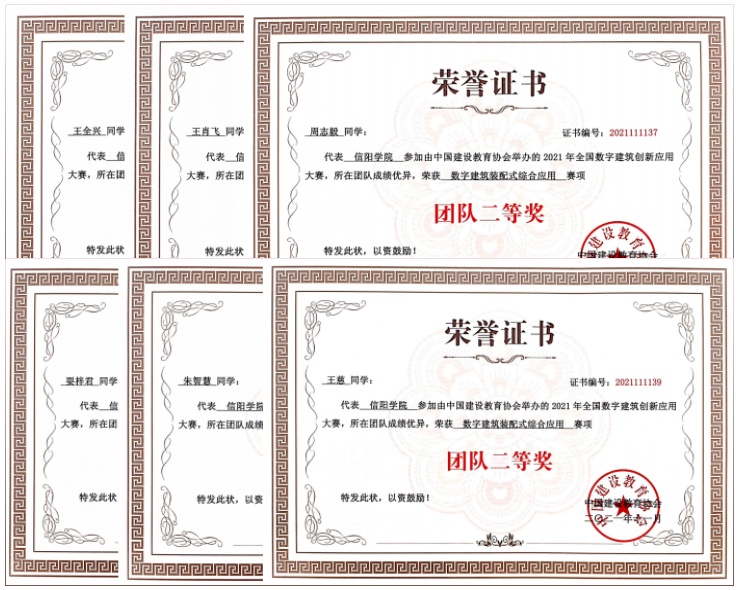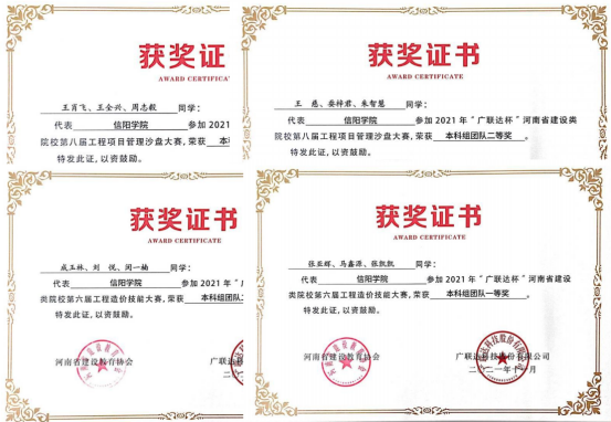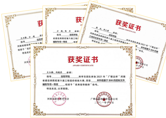 我校本次共有12名同学组成的四支队伍进入全国总决赛,队员分别是:2018级工程造价专业的王慈、耍梓君、王全兴、王肖飞、周志毅,2020级工程造价(专升本)的张凯凯、张亚辉、马鑫源、成玉林、刘悦、朱智慧和2020级工程造价专业闵一楠。他们不怕吃苦、勤学苦练,在暑假前后进行了为期四个月的紧张培训和赛前模拟练习,并在河南省比赛中一举夺得团队一等奖1项,团队二等奖3项,专项一等奖4个,优秀教师奖8个。专项奖分别是:BIM招标文件编制专项一等奖2个、BIM施工组织应用专项一等奖2个。此次国赛获奖是在省赛优异成绩的基础上再创佳绩。