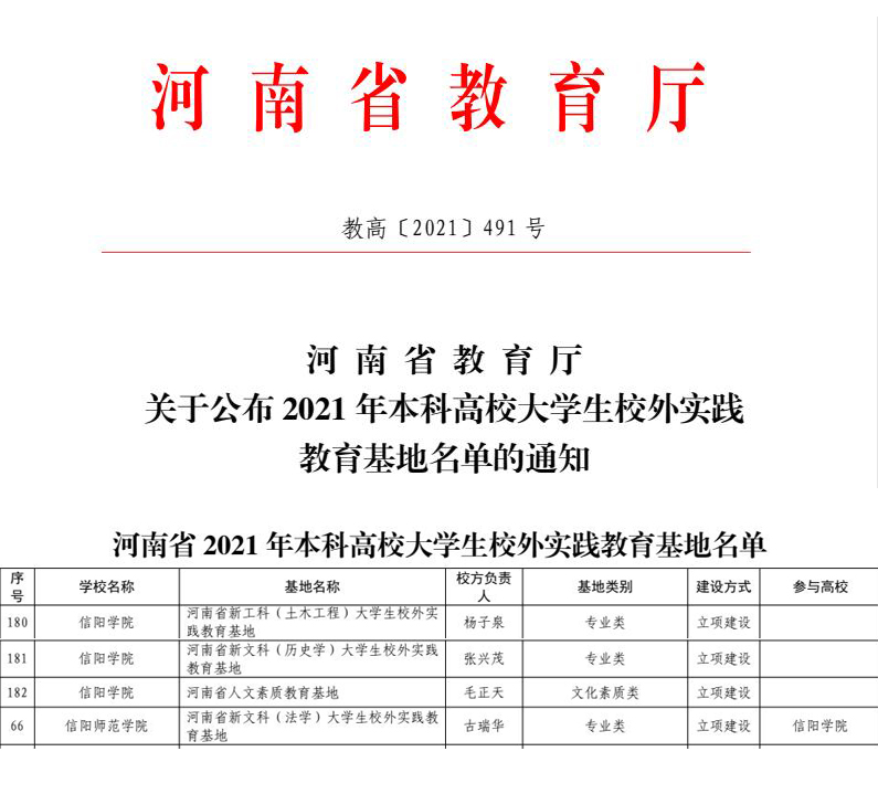 本次我校申报的“河南省新文科(历史学)大学生校外实践教育基地”“河南省人文素质教育基地”和“河南省新工科(土木工程)大学生校外实践教育基地”为我校独自立项建设项目,“河南省新文科(法学)大学生校外实践教育基地”是我校参与信阳师范学院共同建设项目。