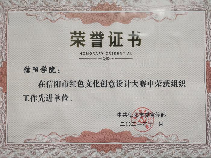 2021年4月份以来,信阳市委宣传部会同15个部门和高校,联合举办了首届信阳市红色文化创意设计大赛。我校和学院高度重视此次比赛,积极组织相关师生组建团队参加比赛,共由8位教师与12位学生组成8个设计团队。通过师生共同创作,通过初选后送交决赛,最终取得了优异成绩。