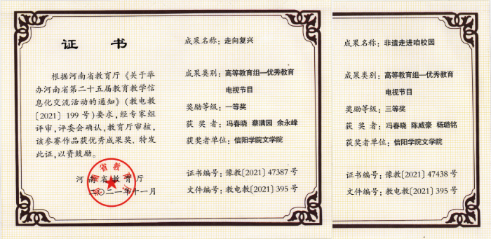 经单位申报、专家评审、结果公示等环节,我校文学院教师冯春晓的作品《走向复兴》荣获高等教育组优秀教育电视节目一等奖,该作品视角独特,主题鲜明,紧扣时代热点,展示了当代师生风采。冯春晓老师另一作品《非遗走进咱校园》获得三等奖,该作品反映信阳学院对非遗进校园的认识、理念和做法,展示了我校以非遗进校园为抓手,坚持非遗与教学相结合,传承和弘扬非遗文化,取得的良好效果和社会反响。