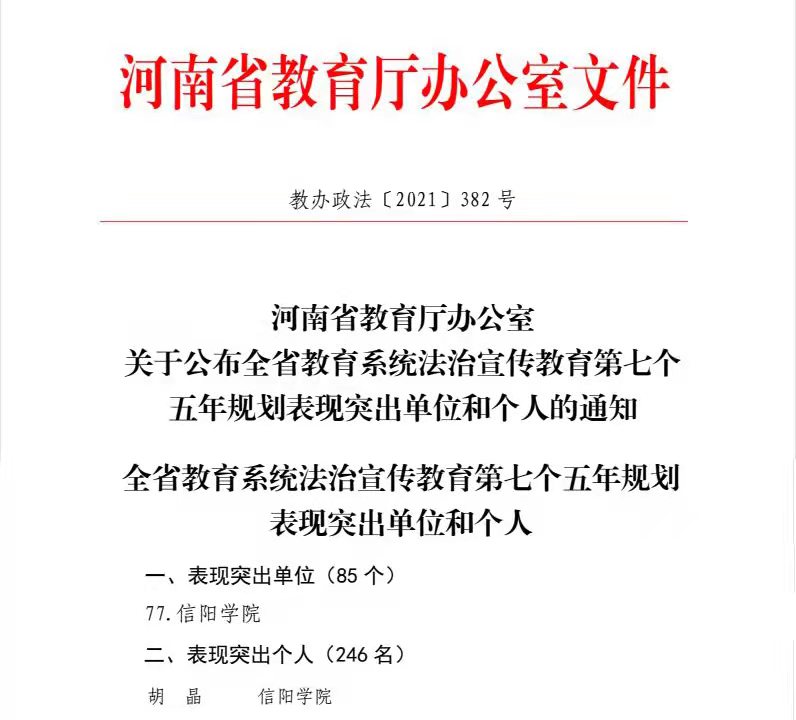 近日,河南省教育厅发布了《关于公布全省教育系统法治宣传教育第七个五年规划表现突出单位和个人的通知》(教办政法〔2021〕382号),信阳学院荣获全省教育系统法治宣传教育第七个五年规划表现突出单位,信阳学院社会科学学院胡晶老师荣获表现突出个人。