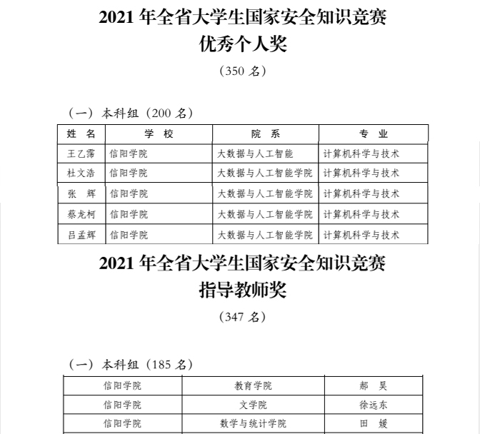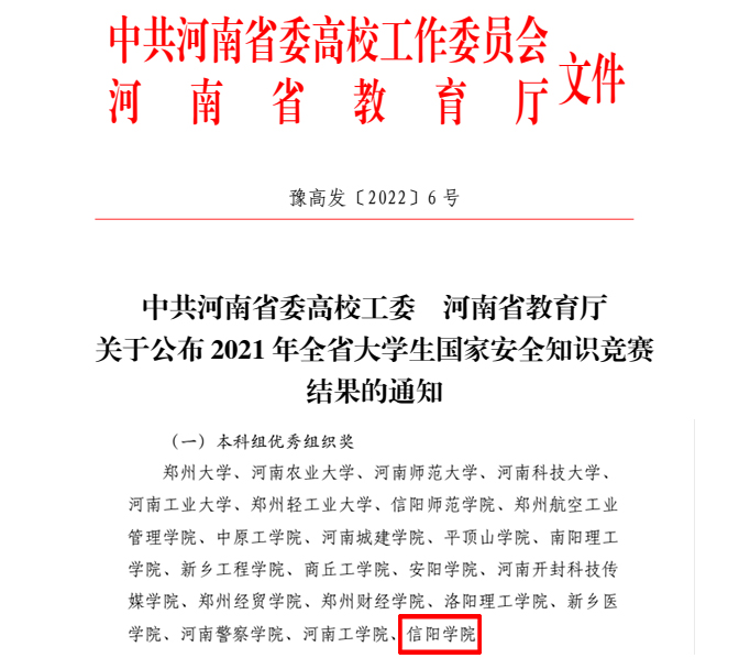 近日,中共河南省委高校工委、河南省教育厅下发了《关于公布2021年全省大学生国家安全知识竞赛结果的通知》(豫高发〔2022〕6号),我校在全省高校本科组中成绩优异,荣获此次竞赛优秀组织奖,大数据与人工智能学院杜文浩等5名同学荣获优秀个人奖,文学院徐远东、教育学院郝昊、数学与统计学院田媛等3名老师荣获指导教师奖。