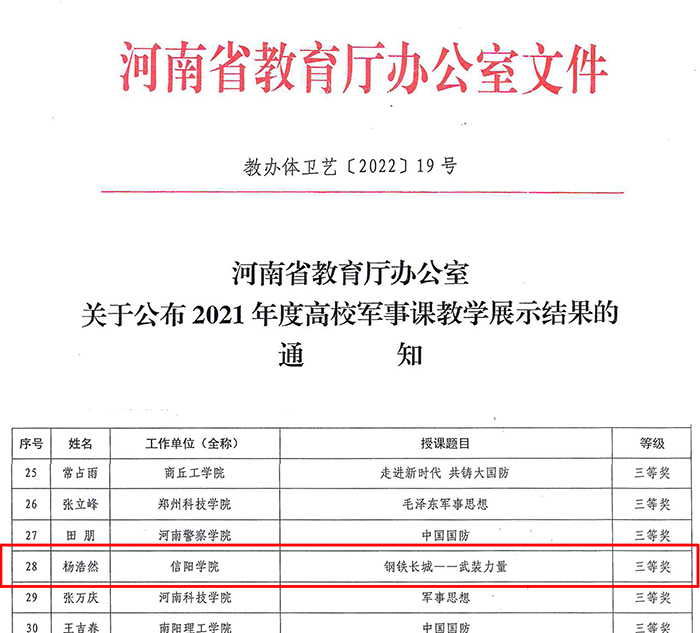 近日,河南省教育厅发布《河南省教育厅办公室关于2021年度高校军事课教学展示结果的公示》(教办体卫艺〔2022〕19号),我校青年教师杨浩然申报的课程《钢铁长城——武装力量》荣获三等奖。