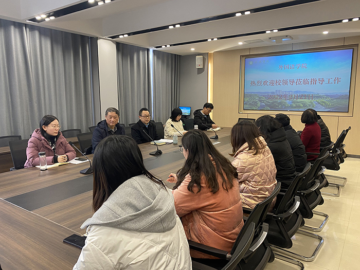 2月21日,熊健民深入外国语学院调研指导春季学期开学工作,与学院班子成员及教研室主任进行座谈交流。熊健民在听取学院评建工作汇报后,对学院的各项工作给予了充分肯定,并对学院新学期工作提出了明确要求。他强调,一是围绕学校“1234”整体布局,以迎评促建为中心开展各项工作。二是牢牢抓好思想政治教育工作,守好学院意识形态工作阵地。三是坚持不懈抓好师资队伍建设,不断提升教师能力水平。四是一如既往做好疫情防控和安全稳定工作。