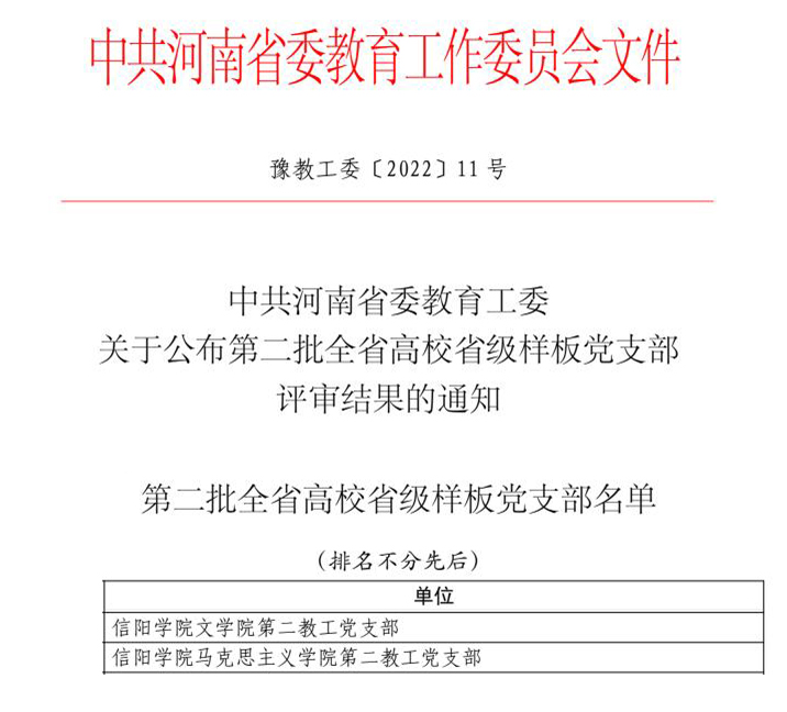 近日,河南省委教育工委公布了第二批全省高校省级样板党支部评选结果。在学校自评推荐、专家评审、综合考评的基础上,经省级样板党支部评定小组研究,确定我校文学院第二教工党支部和马克思主义学院第二教工党支部为“第二批全省高校省级样板党支部”。这是我校基层党支部建设取得的重要标志性成果,展现了学校基层党组织标准化、规范化建设取得的显著成效。