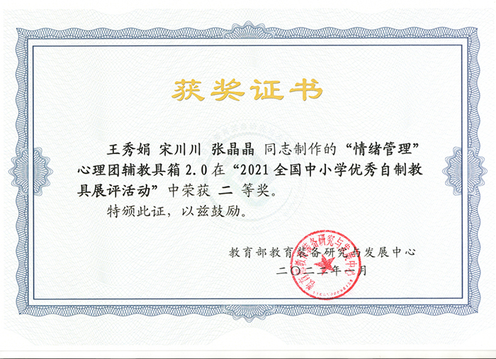 展评活动分为省赛、省内遴选、国赛三个环节。此前《情绪管理心理团辅教具箱1.0》在第十七届河南省中小学优秀自制教具暨学生科技创新小制作小发明展评活动中已获省中小学教学科研成果奖一等奖。经过三年不断的研发和升级,完成了1.0教具箱到2.0版本的迭代,在省内遴选会中,从四年省赛的数十件一等奖作品中脱颖而出,成功入围国赛,并在全国595件作品中获评二等奖。我校客座教授、信阳市十三小校长王秀娟荣获全国中小学优秀自制教具展评活动自制教具能手称号。