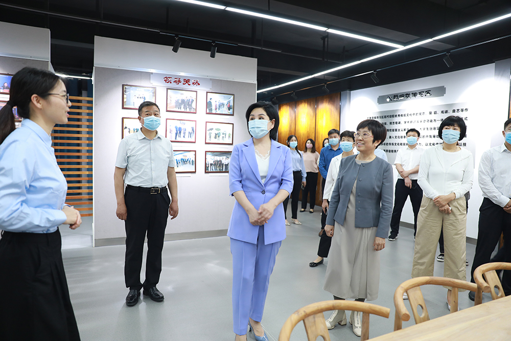 曾辉一行实地查看了学校优秀传统文化传承馆,观看了优秀传统文化进校园宣传片,参观了皮影展示制作、歌舞戏曲传习、文化创意产品等区域,听取了讲解人员的详细介绍,并与大家就优秀传统文化传承等进行亲切交流。