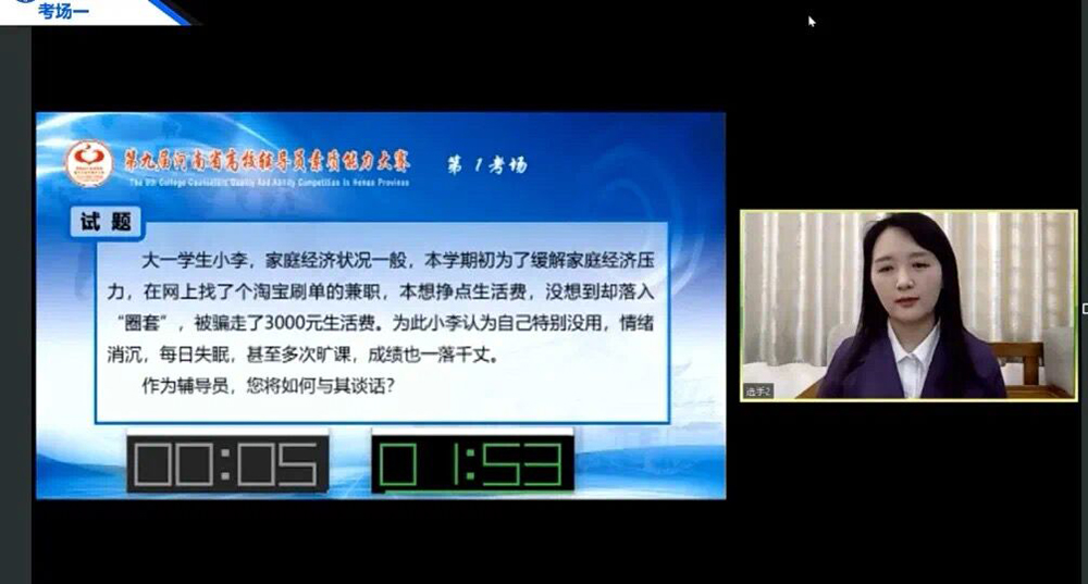 本次大赛由省委教育工委、省教育厅主办,共计130所高校推选133名选手参赛。大赛分为复赛和决赛两个环节,包括基础知识测试、案例分析、谈心谈话三个项目,综合考察了参赛辅导员的知识储备、精神风貌和职业能力。为积极响应疫情防控相关要求,此次比赛采用线上进行,全程采用视频号直播。陶思宇凭借扎实的理论功底和出色的临场表现,一路过关斩将,荣获一等奖。