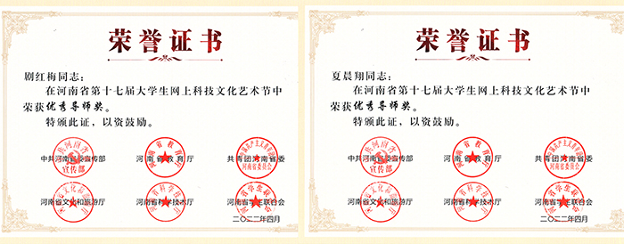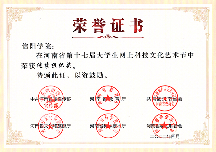 近日,省委宣传部、省教育厅、团省委、省文化和旅游厅、省科学技术厅、省学联联合下发了《关于发布河南省第十七届大学生网上科技文化艺术节获奖作品(个人)和优秀组织单位名单的通知》(豫青联字〔2022〕9 号),信阳学院共有37项作品获奖,同时获得“优秀组织奖”。