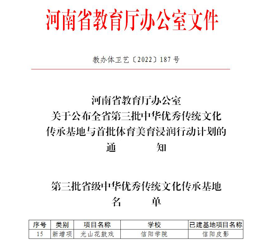 日前,省教育厅发布《关于公布全省第三批中华优秀传统文化传承基地与首批体育美育浸润行动计划的通知》(教办体卫艺〔2022〕187号),我校申报的“光山花鼓戏”传承项目入选河南省中华优秀传统文化传承基地。这也是我校继2019年获批河南省首批中华优秀传统文化传承基地之后,取得的又一重要成果。