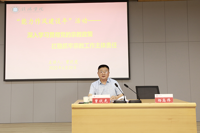 为深入学习习近平总书记关于宗教工作的重要论述、贯彻落实新时代党的宗教工作政策,推动“大学习大培训大练兵大提升”活动走深走实,6月20日上午,我校举办党的宗教政策专题培训会。省委统战部、省委教育工委党的宗教政策宣讲团成员,豫南区域统战工作牵头高校联系人,信阳师范学院党委委员、统战部长曾伏虎应邀到我校作《深入学习贯彻党的宗教政策 扛稳抓牢宗教工作主体责任》专题报告。纪委书记、校长助理杨高伟出席并主持培训会。党群部门负责同志,各学院党总支书记、学工秘书及全体辅导员参加了培训会。