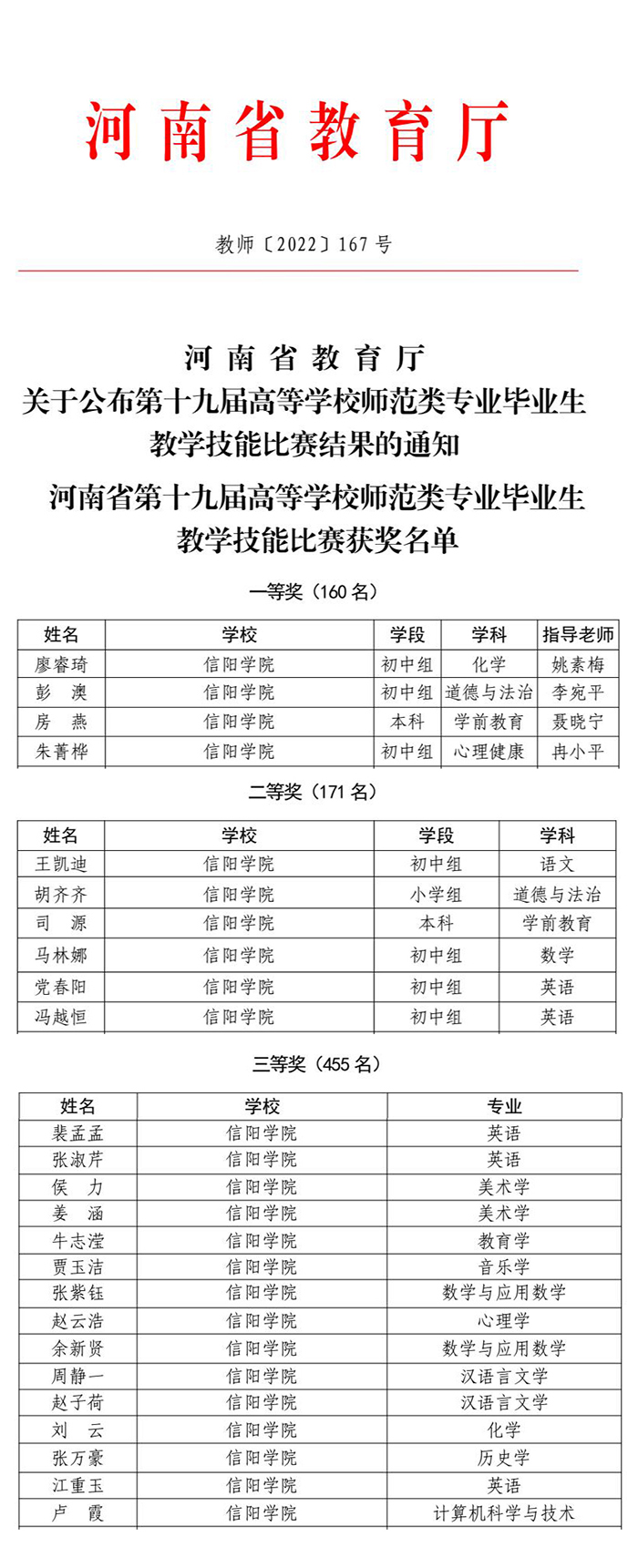 近日,河南省教育厅发布了《关于公布第十九届高等学校师范类专业毕业生教学技能比赛结果的通知》(教师[2022]167号),我校参赛学子经过激烈角逐,取得了优异成绩。其中,理工学院廖睿琦,文学院彭澳、朱菁桦,教育学院房燕等4名同学获得一等奖,文学院王凯迪等6名同学获得二等奖,外国语学院裴孟孟等15名同学获得三等奖。