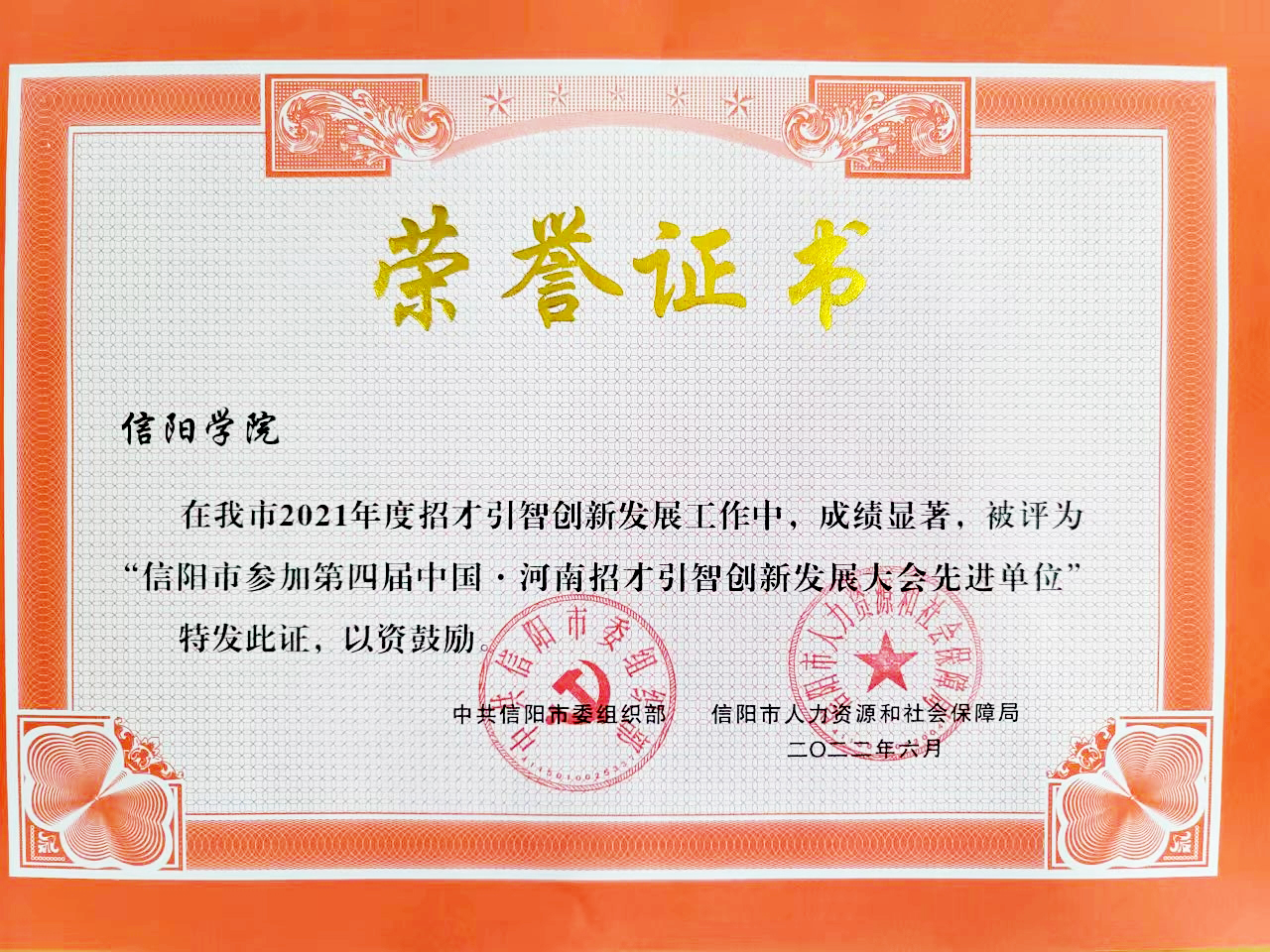 近日,中共信阳市委组织部与信阳市人力资源和社会保障局联合下发了《关于表彰我市参加第四届中国·河南招才引智创新发展大会先进单位和先进个人的通报》(信人社办[2022]17号),对先进单位和先进个人予以表彰。我校被评为信阳市参加第四届中国·河南招才引智创新发展大会“先进单位”;盛士涛同志被评为“先进个人”。