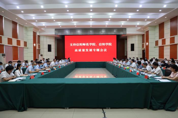 7月2日,信阳市召开支持信阳师范学院、信阳学院高质量发展专题会议。市委书记蔡松涛,市长陈志伟出席会议并讲话。市领导孙巍峰、谢天学、孙同占、谷昌豪、黄钫、杨进、熊静香、吕旅、周慧超出席会议。我校理事长高云、党委书记褚金海和信阳师范学院主要领导出席会议。信阳市相关单位负责人和两校相关部门负责同志参加会议。