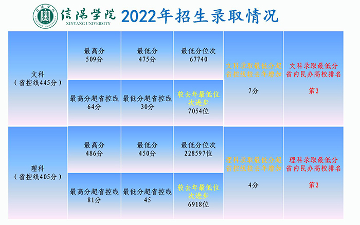信阳学院作为豫南地区首所民办普通本科高校,始终坚持社会主义办学方向,全面贯彻党的教育方针,坚持“师生为本、服务社会”办学理念和“质量立校、人才强校、科研兴校、特色名校”发展战略,不断加大校园基础设施和教学科研投入,建强师资队伍,促进内涵建设,实现了获得多项国家社科基金项目和国家自然科学基金依托单位、硕士学位授权立项建设单位、省级人文社科重点研究基地和中华优秀传统文化传承基地、省级“双一流”专业和课程、省级教改项目和成果等重要突破。同时,大力加强党建和思想政治工作,推进思政课和课程思政建设,打造“全员德育导师制”等育人品牌;推进“产教融合、协同育人”,加强校政、校企、校校合作和创新创业教育,创办了一批省级品牌专业和创新创业教育示范基地,毕业生考研录取率和创业就业率在同类院校中位于前列,先后获得了“河南省高等学校先进基层党组织”“河南省优秀民办学校”“河南省平安校园”“2021年度高校就业最受欢迎奖”“2021年度河南省最受考生青睐本科高校”等荣誉称号。